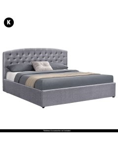 Finley dark grey upholstered full platform bed frame with lifting storage.